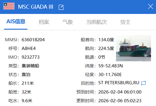 2月4日晚间至5日凌晨,地中海航运旗下的“MSC Giada III”轮在驶往俄罗斯圣彼得堡港的途中,于芬兰湾内瓦湾(Neva Bay)附近海域发生爆炸。