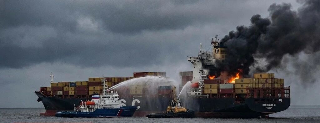 根据俄罗斯媒体及社交平台流出的现场照片显示,“MSC Giada III”轮的上层建筑后方冒出滚滚黑烟和明显火焰。