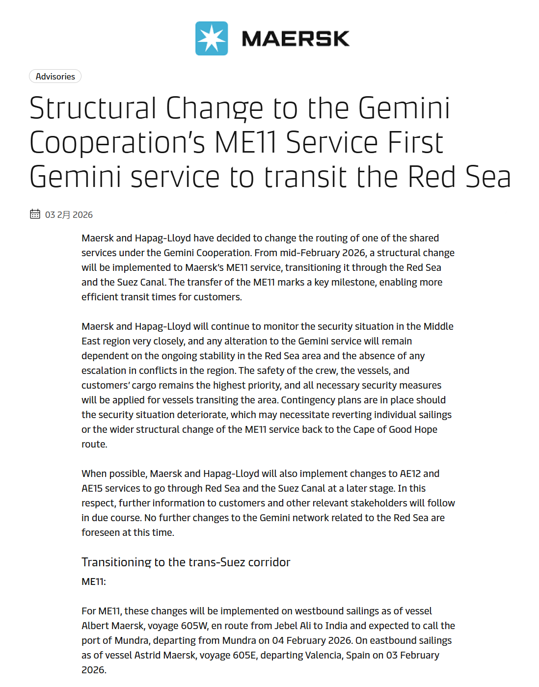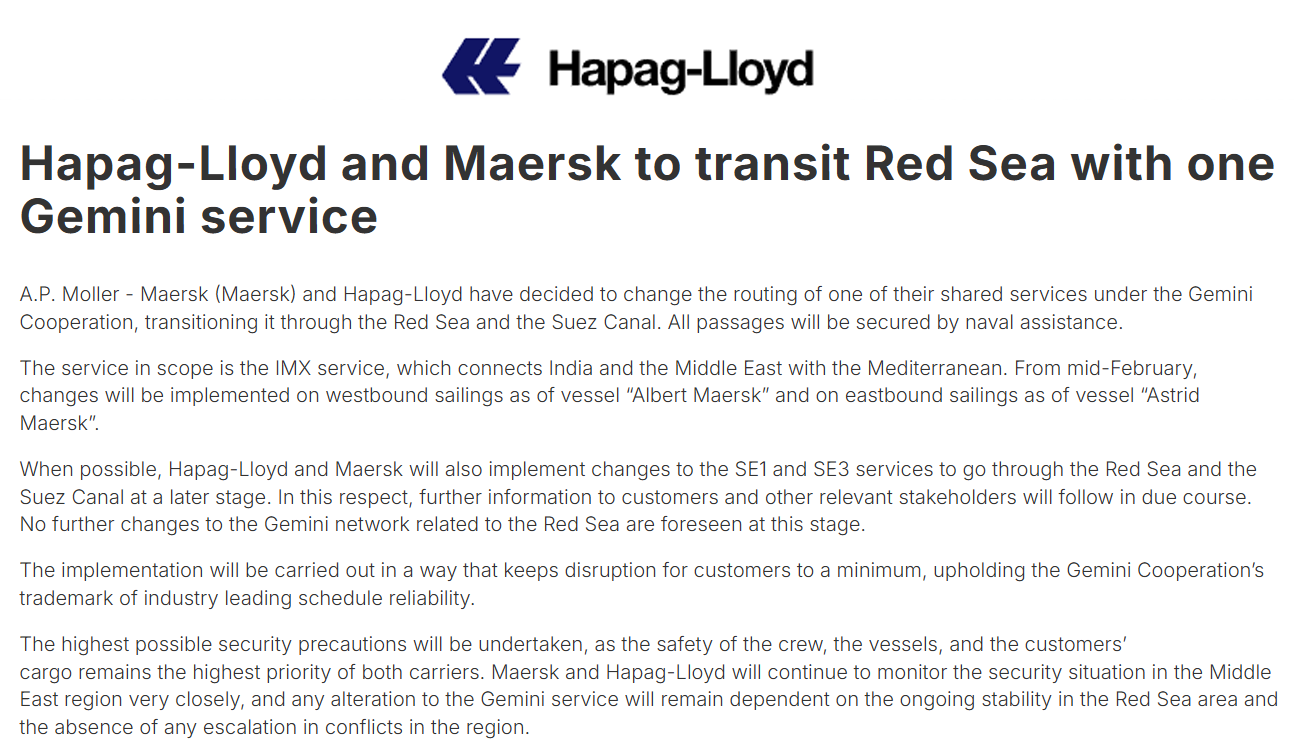 当地时间2月3日,刚刚正式运营的Gemini(双子星)联盟两位巨头——马士基(Maersk)与赫伯罗特(Hapag-Lloyd)同步发布重磅公告:宣布重启红海航线!