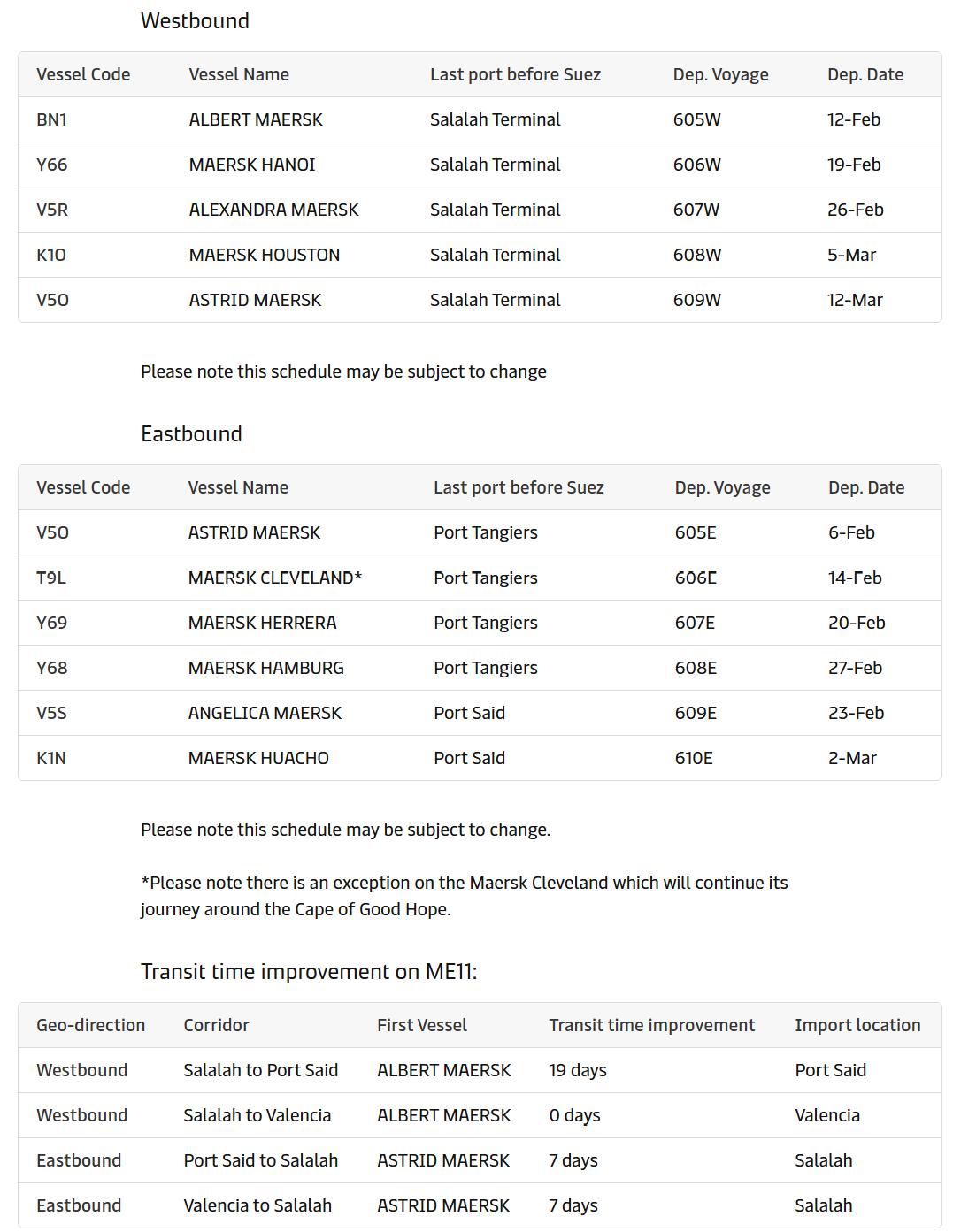 东行: 由 “Astrid Maersk” 轮(航次 605E)执行,已于2月3日从西班牙巴伦西亚出发。