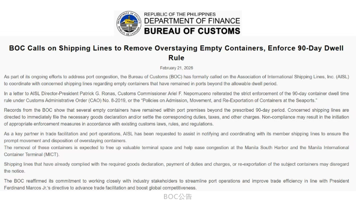 2月22日,为了解决长期困扰马尼拉港口的拥堵难题,菲律宾海关局(BOC)近期正式出重拳整治。明确要求各航运公司必须严格遵守现行的管理规定,尽快处理掉在港口超过90天的空集装箱。