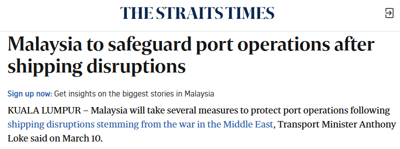 3月11日最新数据显示,受中东局势持续升级影响,新加坡港与马来西亚丹戎帕拉帕斯港的堆场利用率已飙升至90%,处于近乎超负荷状态。