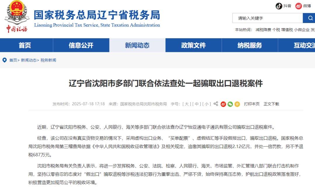 前几天外土司聊航运也写到,辽宁省沈阳市税务、公安、人民银行、海关等多部门联合依法查办辽宁怡亚通电子通讯有限公司骗取出口退税案件。