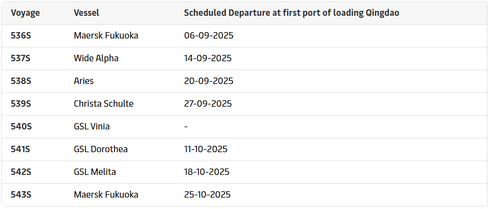 所有计划装载在南行航次(例如:青岛/宁波/上海/香港/盐田)的货物将重新计划在以下Dragon航次(GSL Dorothea航次541S)。