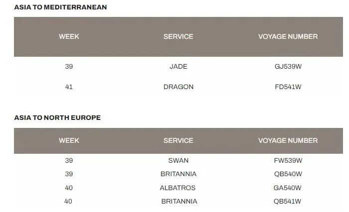 在此之前,MSC也对外发布了2025年国庆黄金周亚欧航线停航计划。按照安排,自第39周至第41周,MSC将取消部分航次,以应对国庆期间出口需求的放缓。