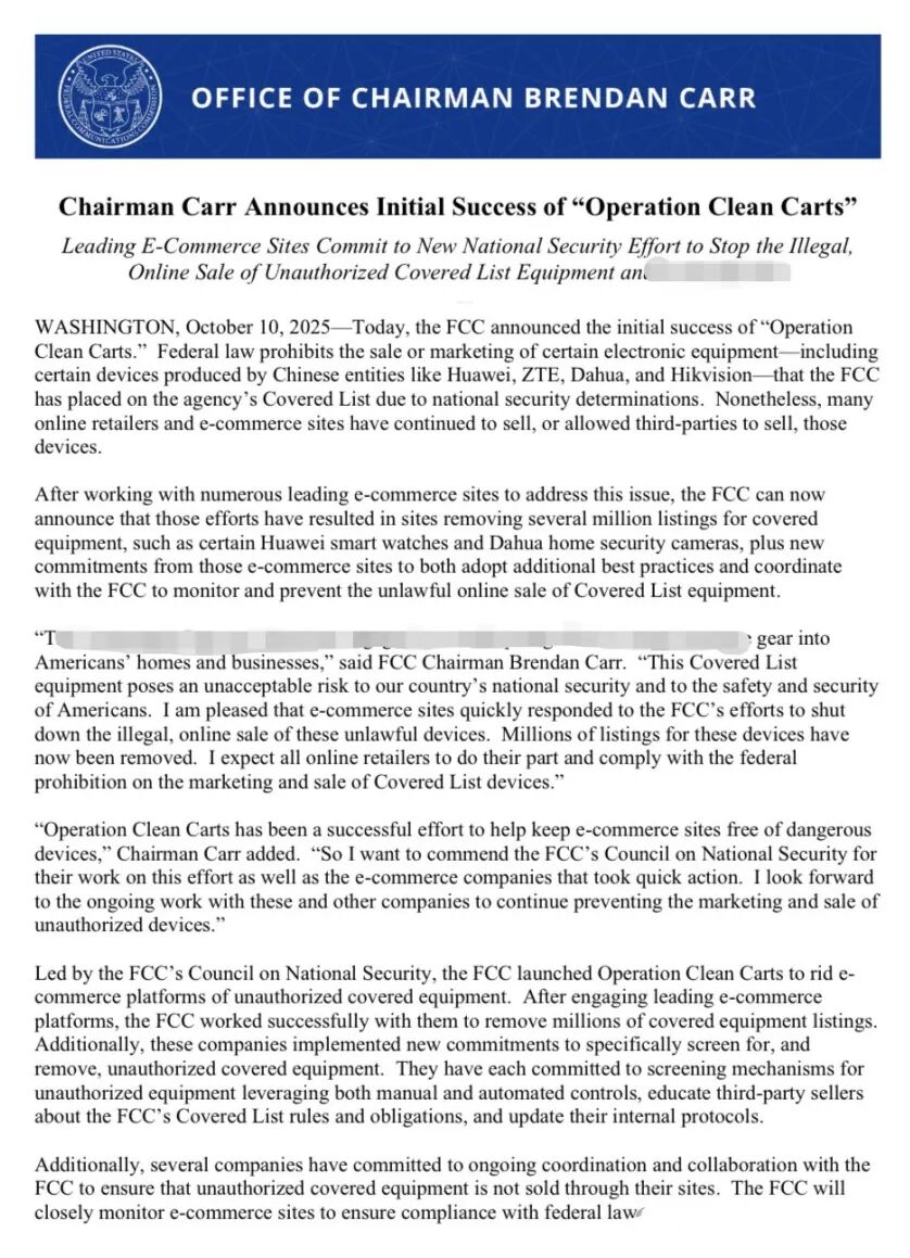 近日,美国联邦通信委员会(FCC)主席布伦丹·卡尔(Brendan Carr)办公室发布公告称,作为 FCC 打击行动的一部分,美国主要在线零售平台已下架数百万件被禁售的中国电子产品。