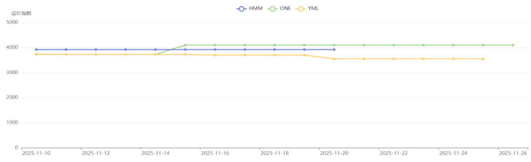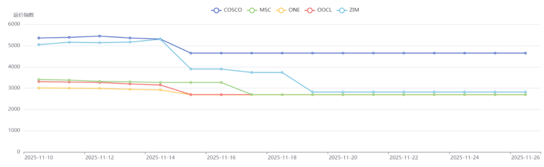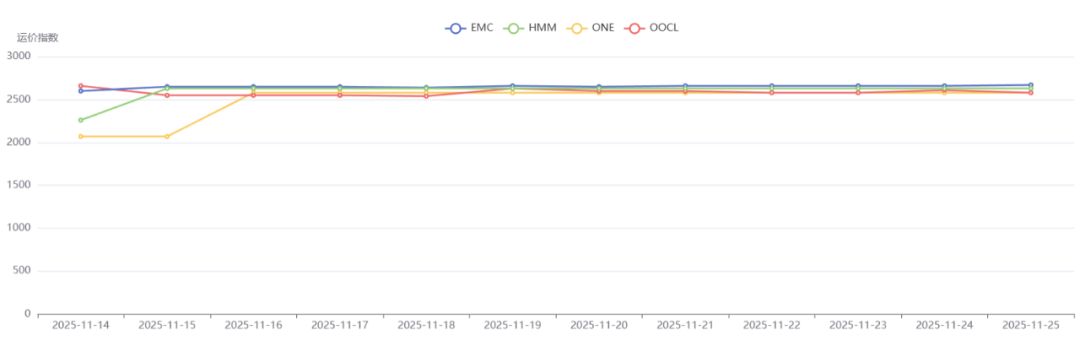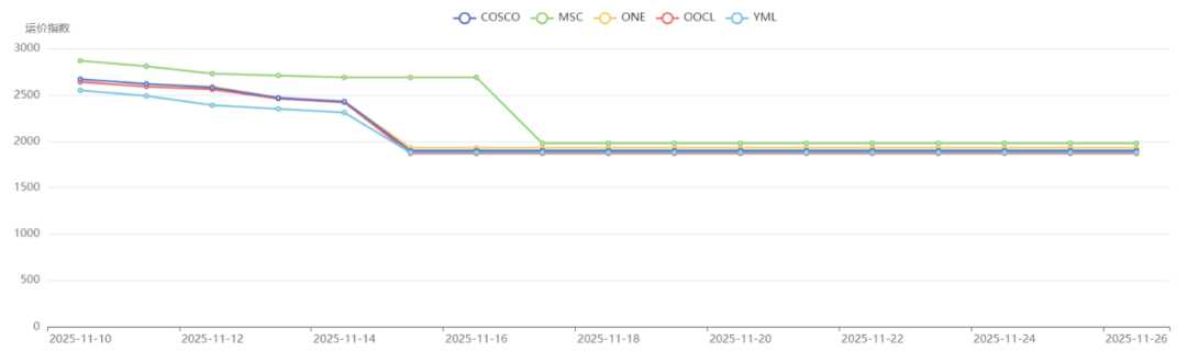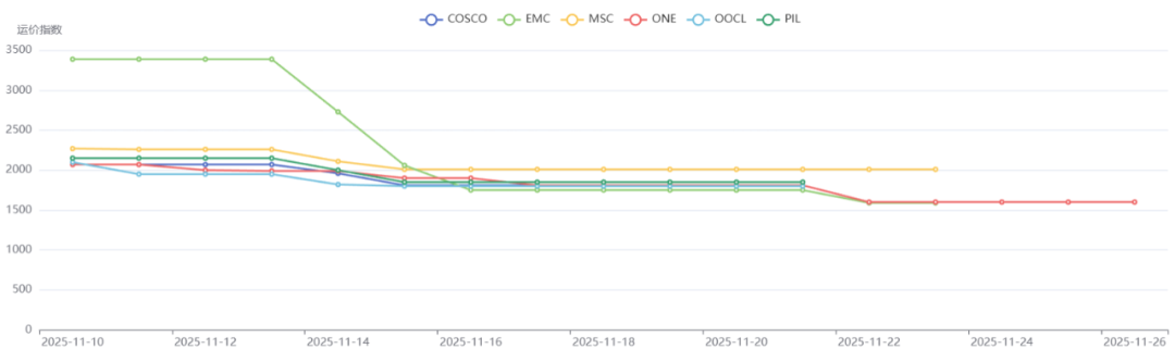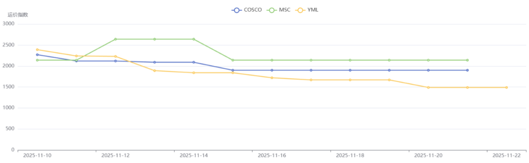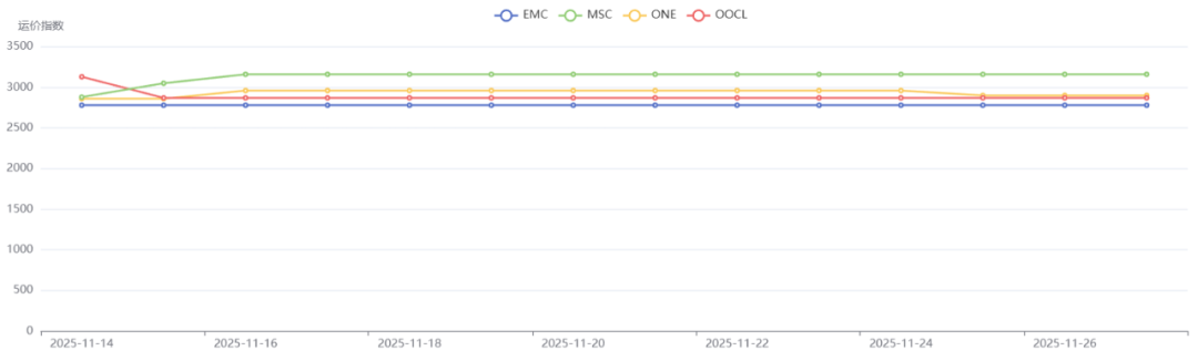北美航线,美国结束了史上最长的政府“停摆”,但运输需求缺乏支撑,即期市场订舱价格下跌。11月14日,上海港出口至美西和美东基本港市场运价(海运及海运附加费)分别为1823美元/FEU和2600美元/FEU,分别较上期下跌17.6%、8.7%。