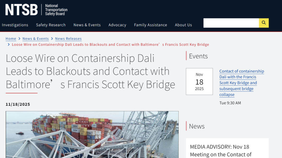 近日,美国国家运输安全委员会(NTSB)批准了“达利”号(Dali)事故的最终报告,报告公布了事故的可能原因。