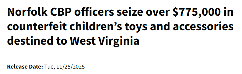 CBP的贸易专家评估了这17,634件儿童产品,其正品制造商建议零售价为776,562美元。而在2024财年,CBP查获了超过3200万件假冒商品,制造商估计正品零售价超过54亿美元。
