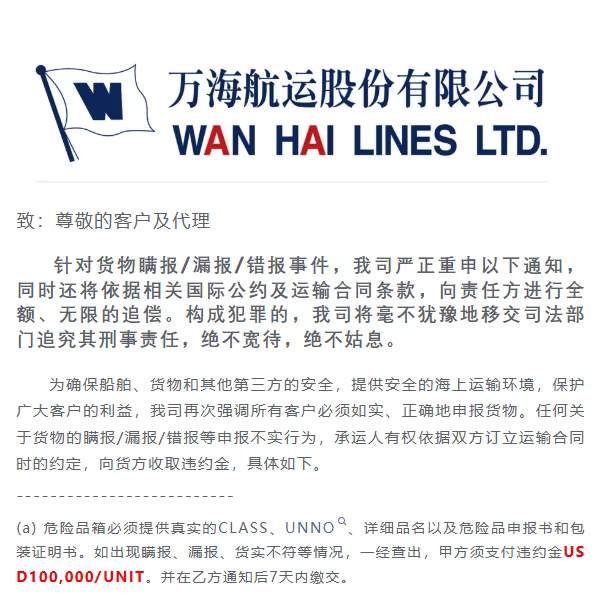 近日,万海航运发布了关于货物瞒报、漏报、错报的通知,重申重要规定。