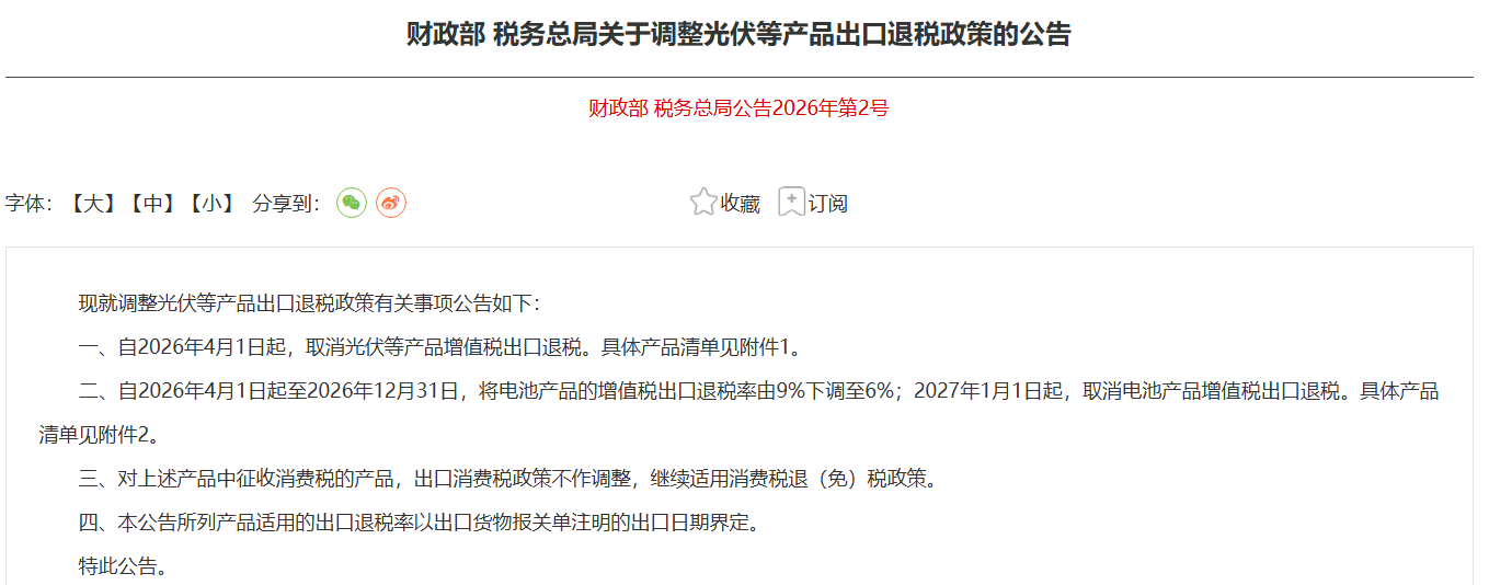 近期,国家财政部与税务总局联合发布新规,自2026年4月1日起,将正式取消光伏及磷化工等产品的出口退税;同时针对电池产品,确定了分两年逐步取消退税的过渡方案。