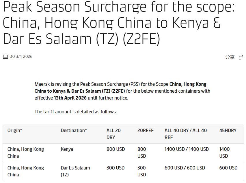 2.马士基-南非/毛里求斯旺季附加费调整公告