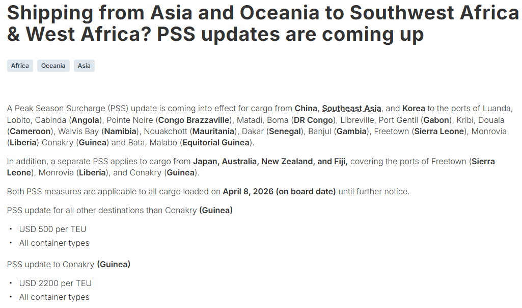 *始发地日本、澳大利亚、新西兰、斐济的货物,旺季附加费单独设置,覆盖目的地塞拉利昂弗里敦、利比里亚蒙罗维亚、几内亚科纳克里
